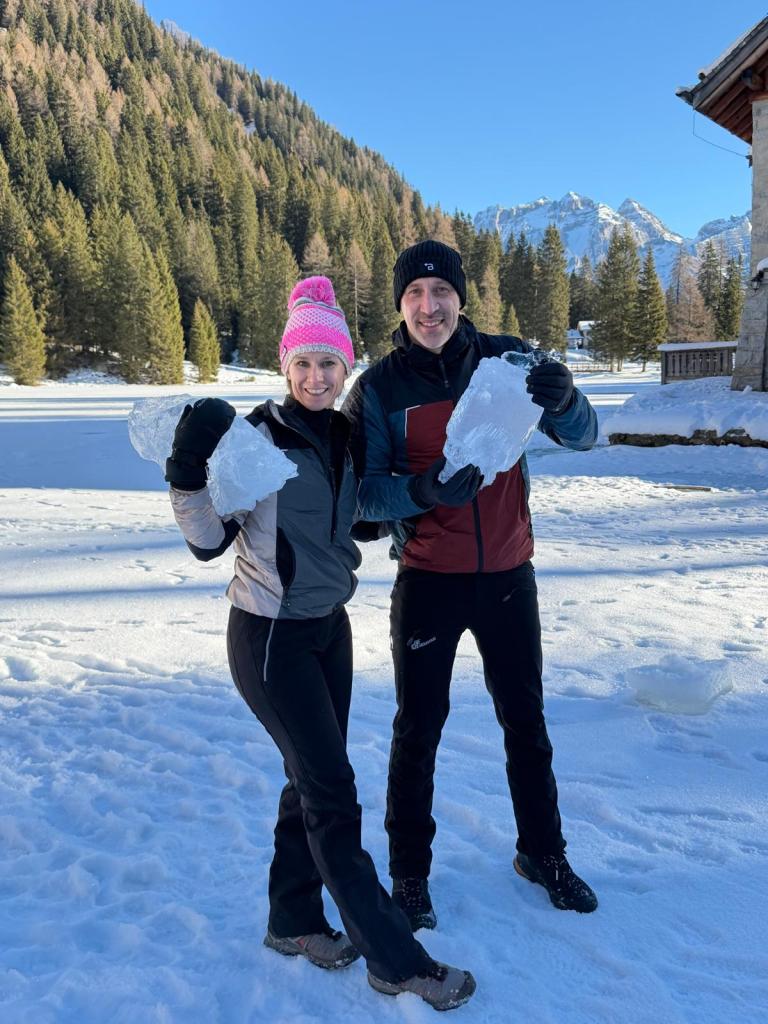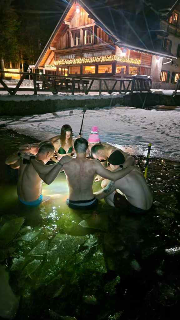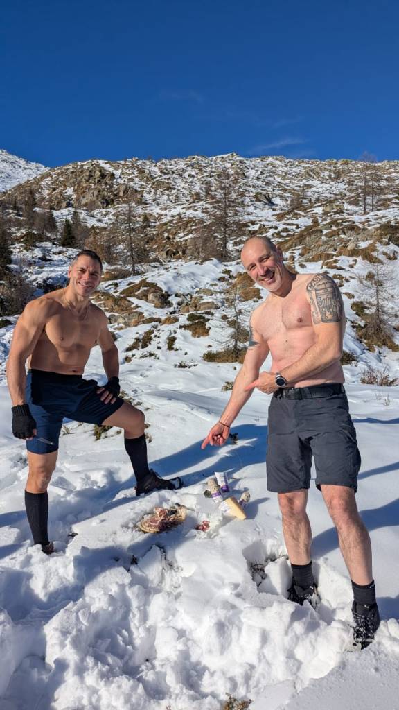 Una volta pronto il varco, ci siamo concentrati, spogliati e siamo entrati nel lago per il primo vero bagno ghiacciato fino alle spalle. Un’esperienza intensa, ma gestita con grande consapevolezza grazie alla respirazione e alla preparazione. Dopo esserci riscaldati, ci siamo rivestiti e ci siamo gustati un delizioso brunch preparato dal rifugio.
