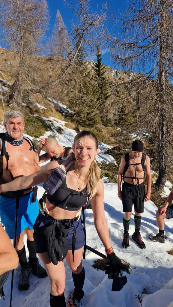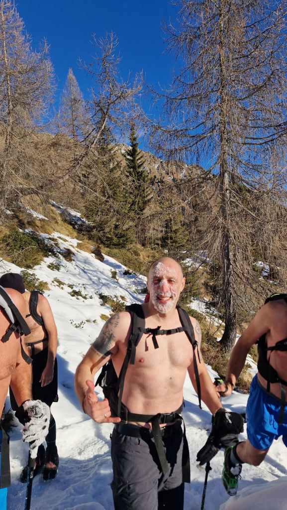 A seguire, siamo partiti per la famosa camminata a torso nudo, concentrati e in silenzio. Questa volta è stata più fluida e naturale: partiti con circa –3 gradi, salendo verso i 2100 metri e accompagnati dal sole, la temperatura è arrivata a quasi 5 gradi.